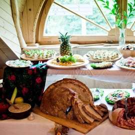 Buffet con insalate, formaggi regionali, frutta succosa dai frutteti polacchi